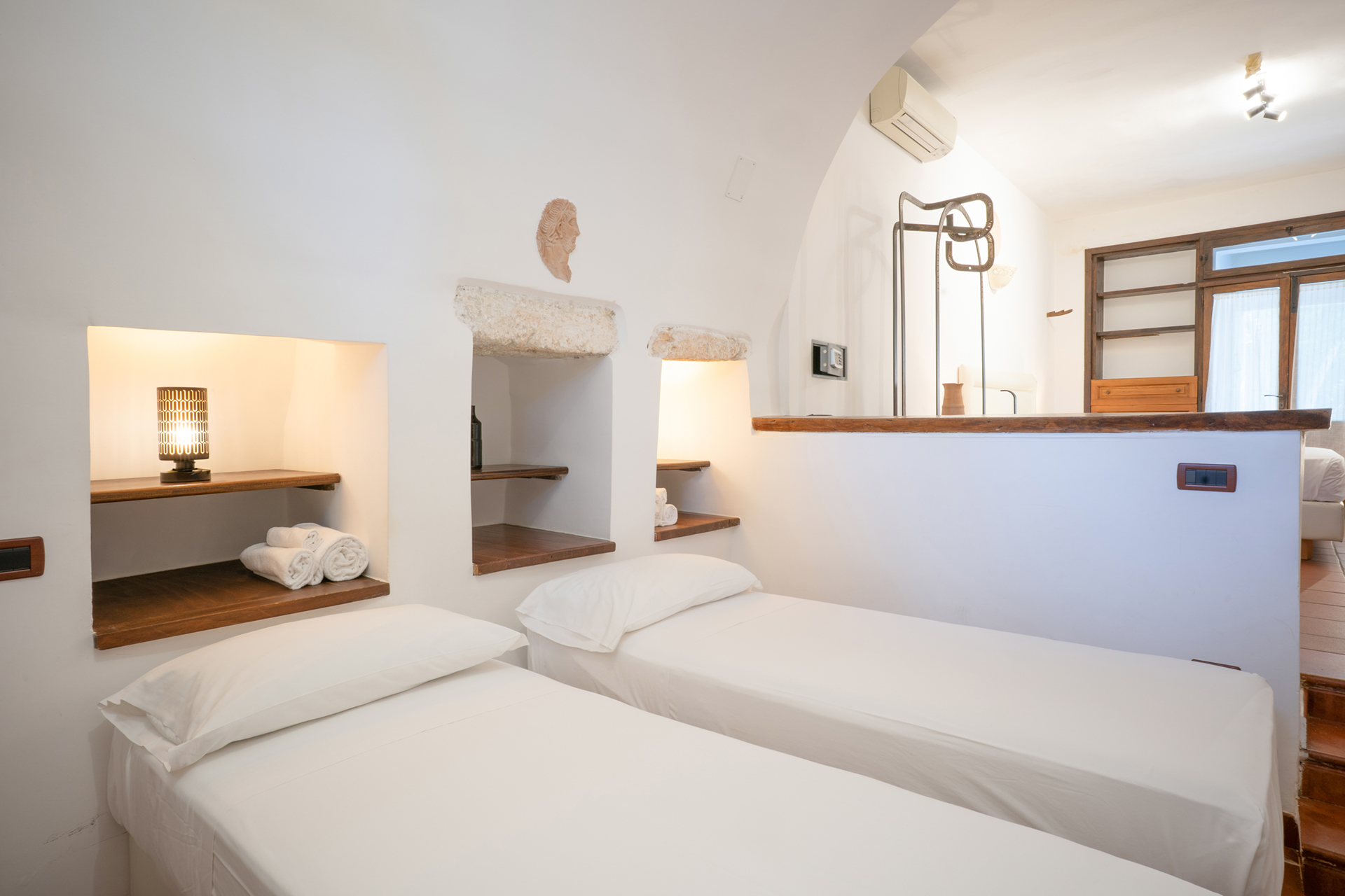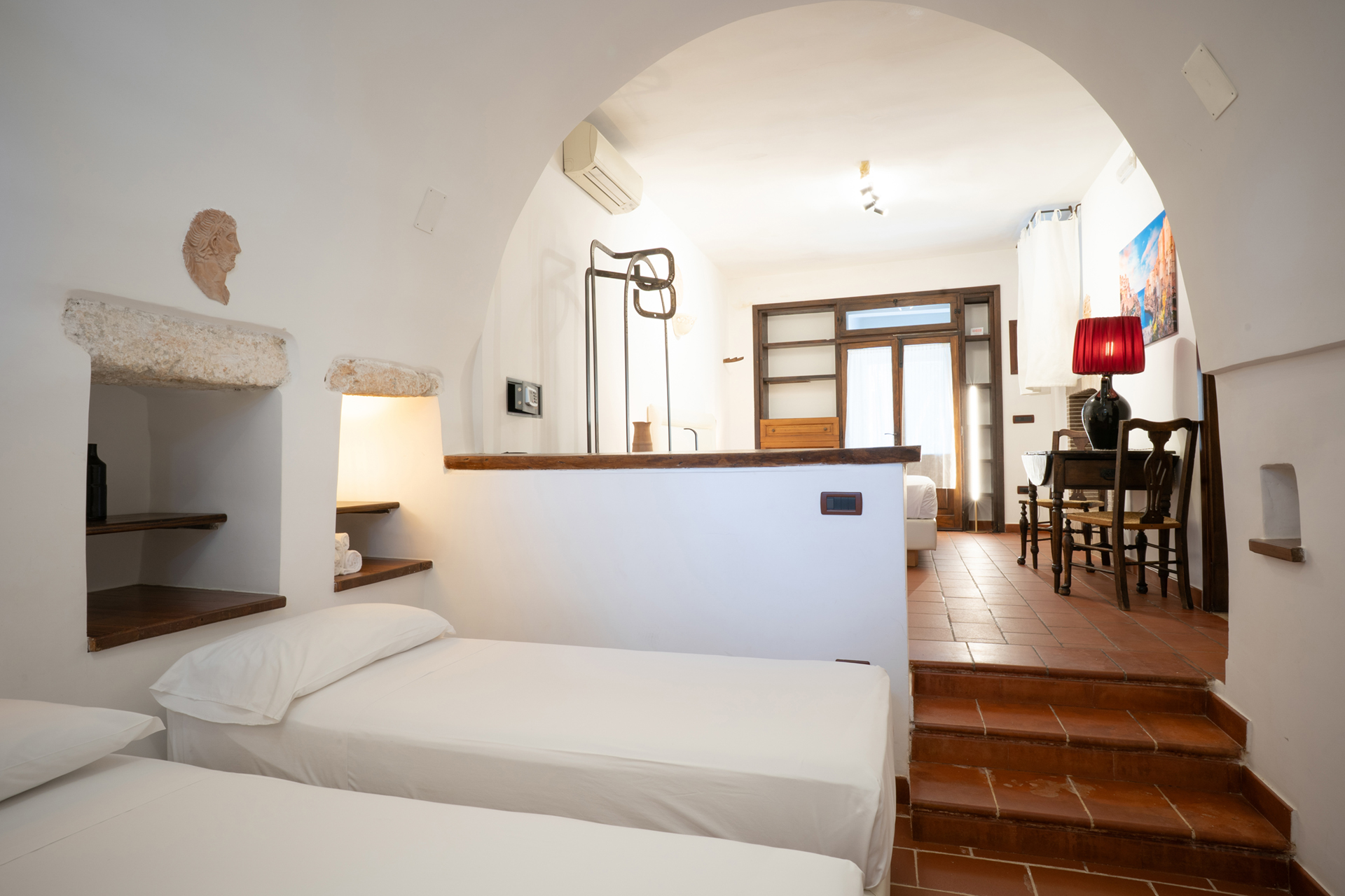 The room is divided into two areas through two small steps which, from the main level where the double bed is located, lead to the space dedicated to the single beds.