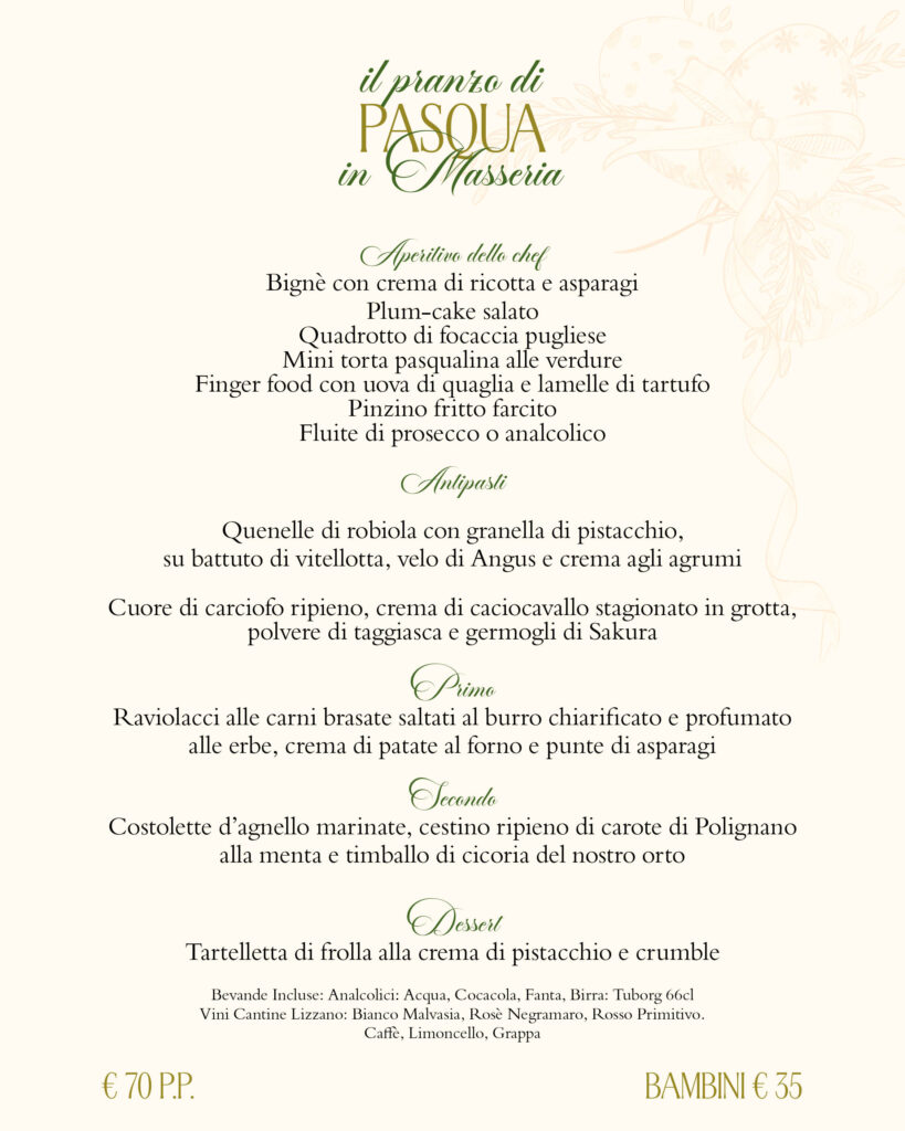La Pasqua in Masseria 2026 è un percorso di sapori che celebra la primavera con eleganza e carattere. Dall’aperitivo dello chef ai raviolacci alle carni brasate, fino alle costolette d’agnello marinate, ogni piatto racconta l’incontro tra tradizione pasquale e ricerca contemporanea.