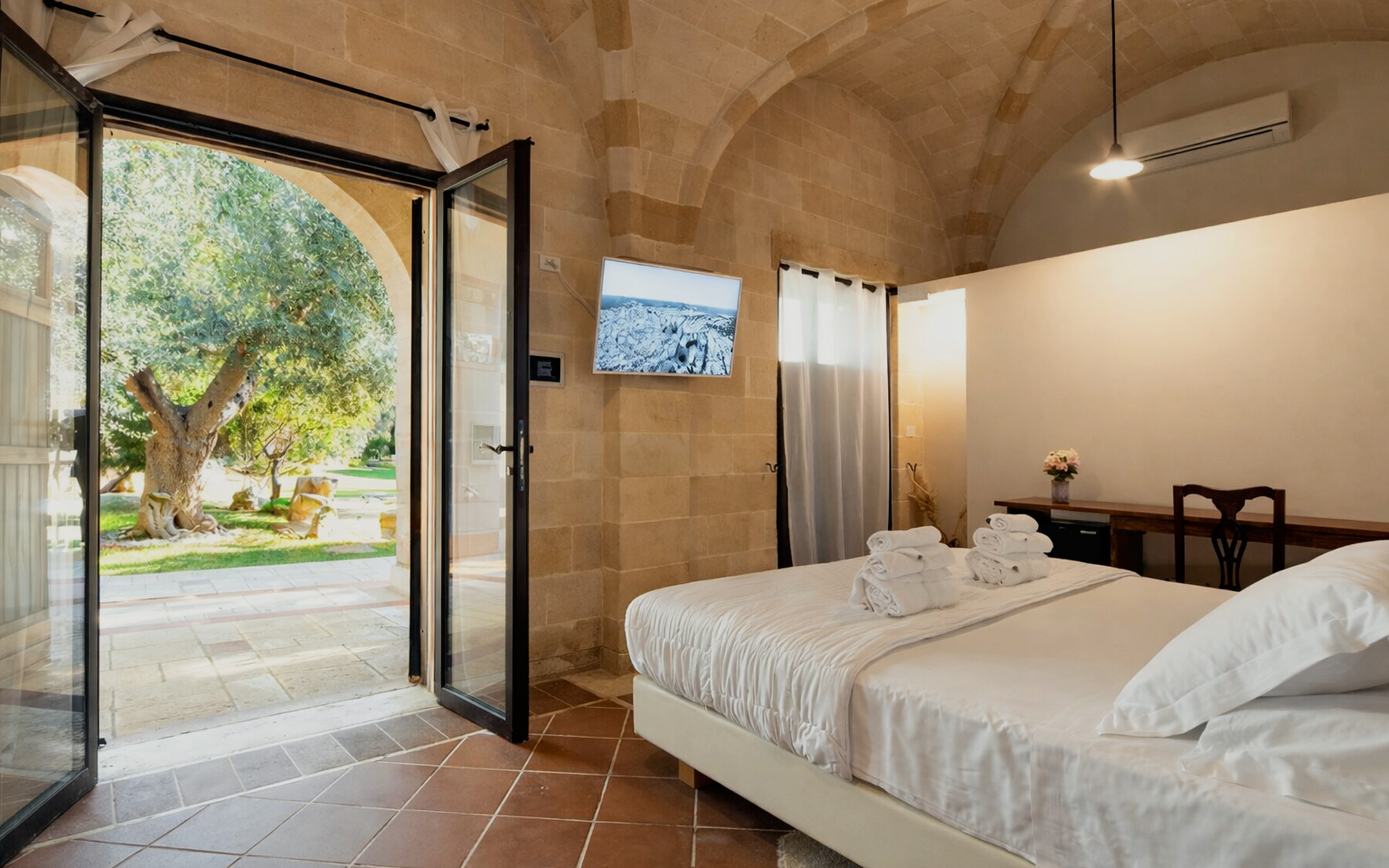 La Superior Suite si contraddistingue per il calore e l’atmosfera accogliente: la sua struttura interamente in tufo è impreziosita dagli arredi realizzati dagli Artigiani locali, dal calore del legno massello e dalle volte a stella tipiche dell’architettura pugliese. Inoltre gli arredi luminosi sono realizzati con le famose ceramiche di Grottaglie.